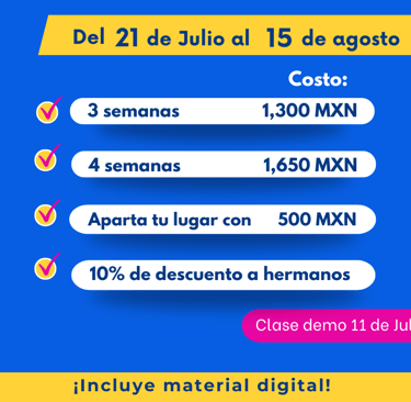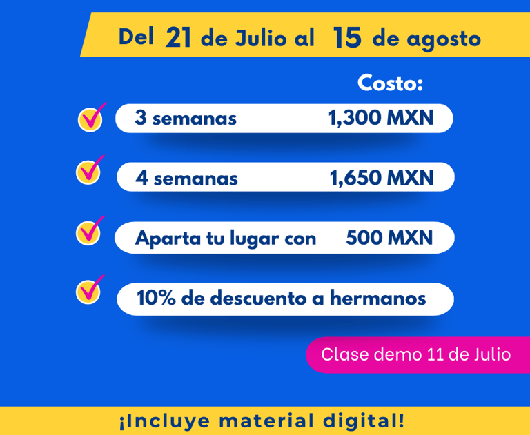 Clases de lunes a viernes de 11:00 a 13:00 hrs.